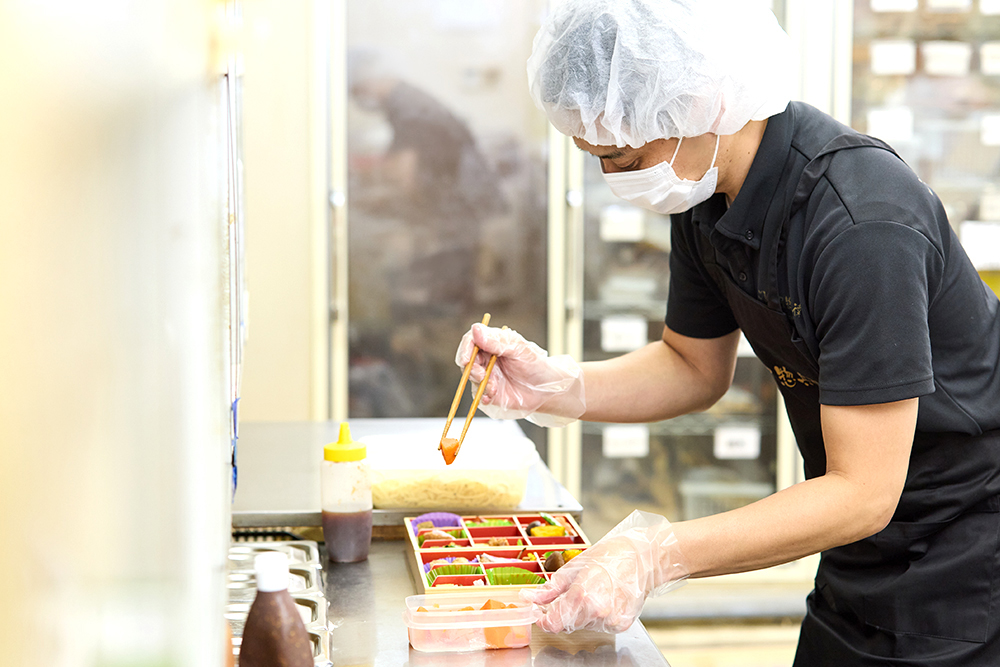 「ご馳走屋惣兵衛」は、宅配弁当という衛生管理が重要な商品を製造・取り扱う上で、全店舗で「HACCP」の考え方を取り入れた衛生管理を実施しています。食品への食中毒菌汚染や異物混入などのリスク要因を工程ごとに把握し、重要管理点を監視・記録することで安全性を確保。また、第三者機関による消費期限検査を実施しております。この導入により、調理から配達まで各工程で衛生基準を満たすよう日々管理・チェックを徹底しています。